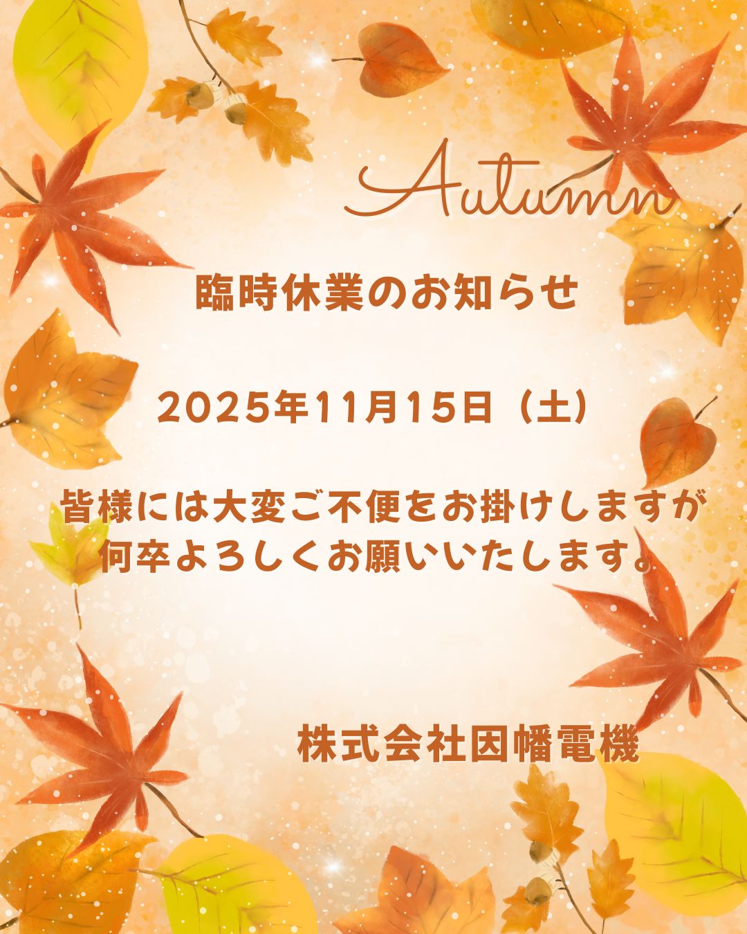 お知らせ 年末年始休業は12/28(土)~1/6(月)となります。